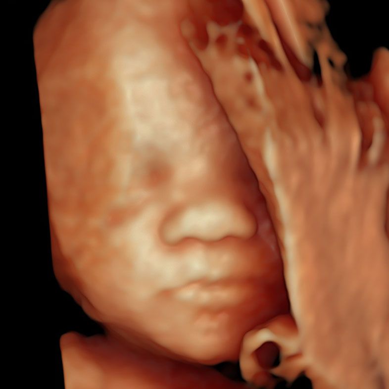 26-29 weeks is ideal for medical 3D ultrasound. This image was captured at our clinic. Baby’s face is partially covered by anterior placenta (on the right side of the image)
