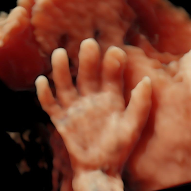 Baby girl with her open hand saying ‘Hello’ to her parents from the screen in our clinic. This image was produced with the help of 4D ultrasound technology.